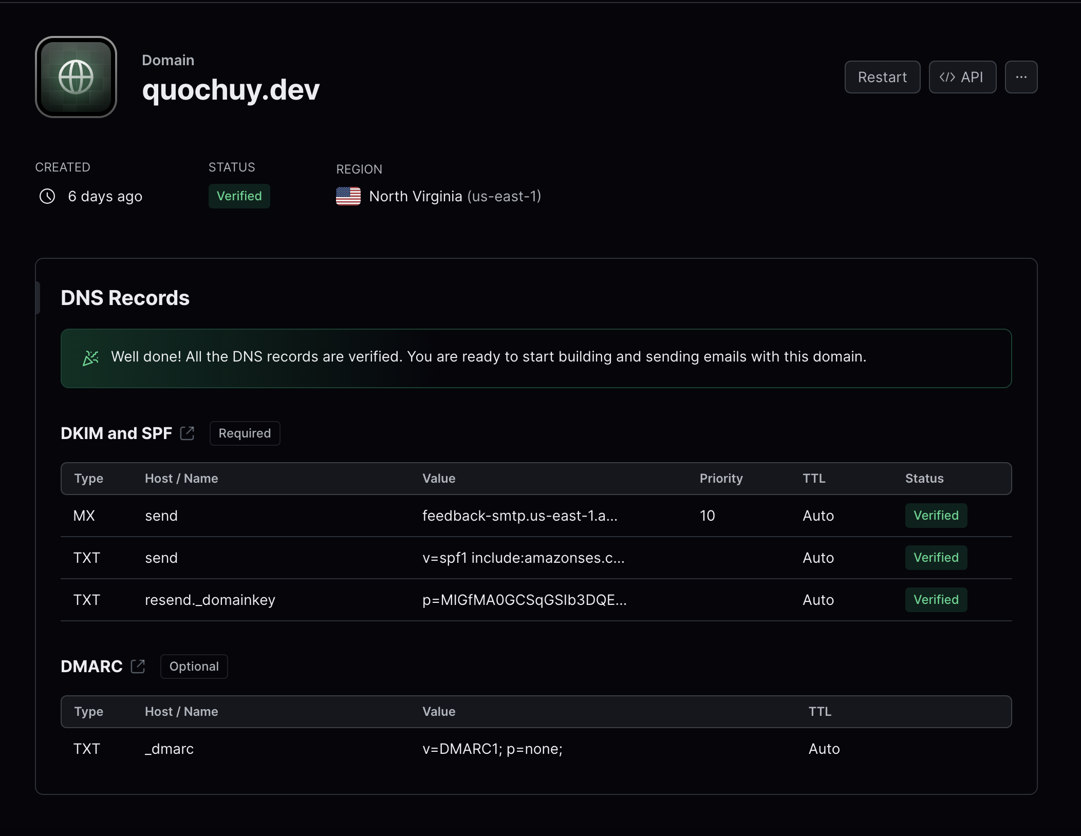 - From Email: Must have domain is registerd on resend.com/domains, exp: admin@quochuy.dev